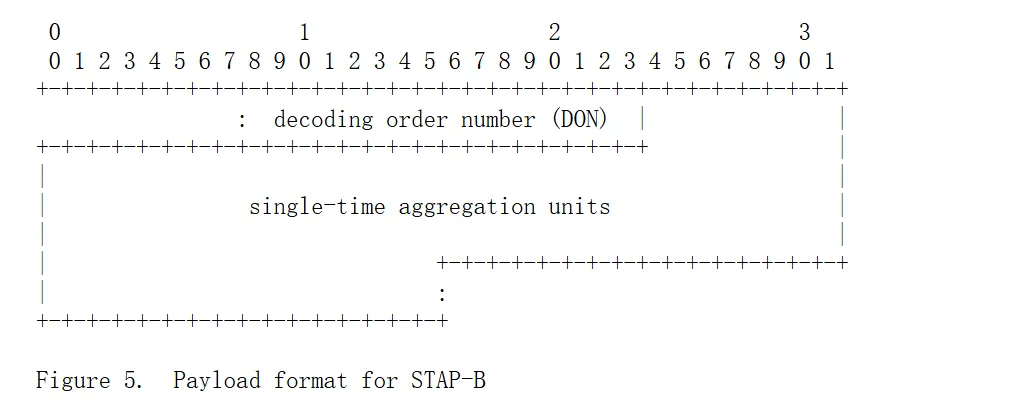 ● STAP-B:其载荷包含一个16位无符号DON(以网络字节序表示),后跟至少一个单一时间聚合单元,其载荷格式如图5所示。