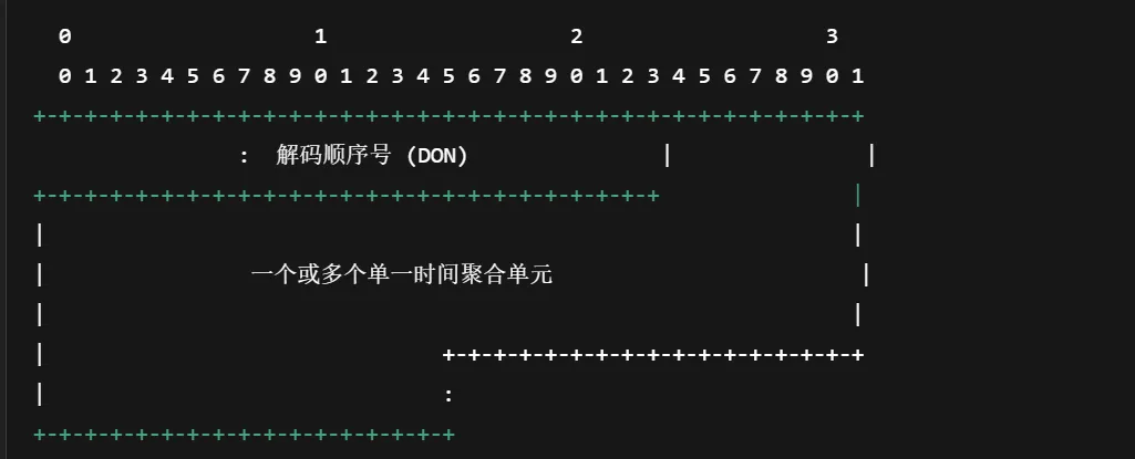 在交织分包模式(interleaved packetization mode)中,NAL 单元的传输顺序允许与其解码顺序不同。“解码顺序号”(Decoding Order Number,DON)是载荷结构中的一个字段或是一个导出变量,用于指示 NAL 单元的实际解码顺序。有关允许传输顺序与解码顺序不同的原因及 DON 使用案例的示例和解释,后面会讲解。