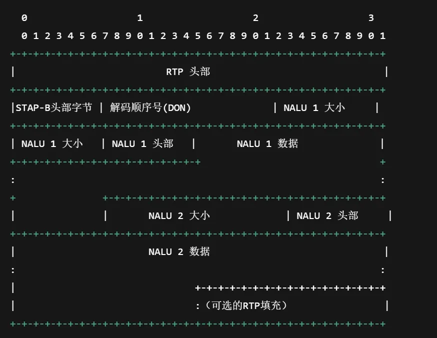 ● STAP-B 中后续的每个NAL单元的 DON 值,依次为前一个NAL单元的DON值加1后再模 65536(即 (前一个 DON + 1) % 65536)。
