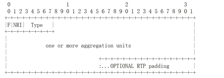 每个需要被携带到聚合包中的NAL单元都封装在一个聚合单元(Aggregation Unit) 中。以下将说明四种不同聚合单元的具体特征。 聚合包的RTP载荷格式结构如图3所示: