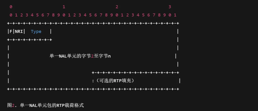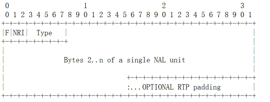 1、单一 NAL 单元包(Single NAL Unit Packet):载荷中仅包含一个单独的 NAL 单元。NAL 头部类型字段与原始的 NAL 单元类型相同,即数值范围为1至23。