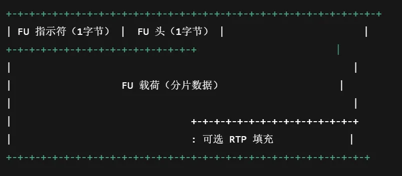 3、分片单元(Fragmentation Unit):用于将单个 NAL 单元分片到多个 RTP 包中传输。存在两种版本: