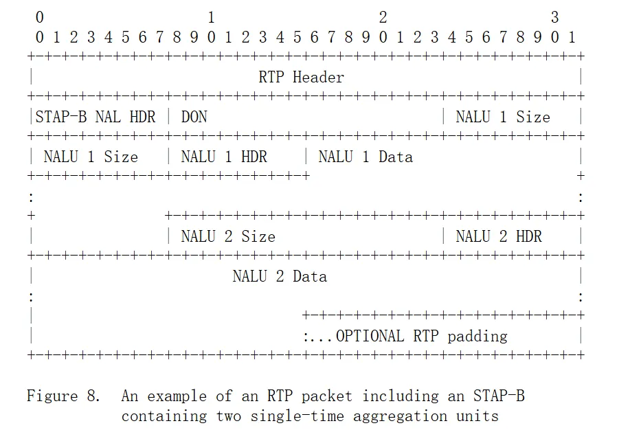图8. 一个包含 STAP-B 的 RTP 包示例(包含两个单一时间聚合单元)