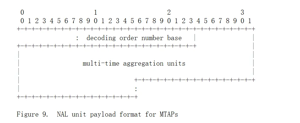 MTAP 的 NAL 单元载荷由一个 16 位的无符号解码顺序号基值(DONB)(网络字节序)和一个或多个多时间聚合单元(multi-time aggregation units)组成,如图 9 所示。