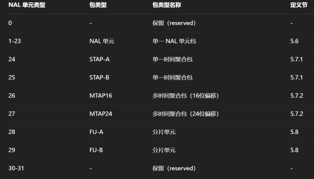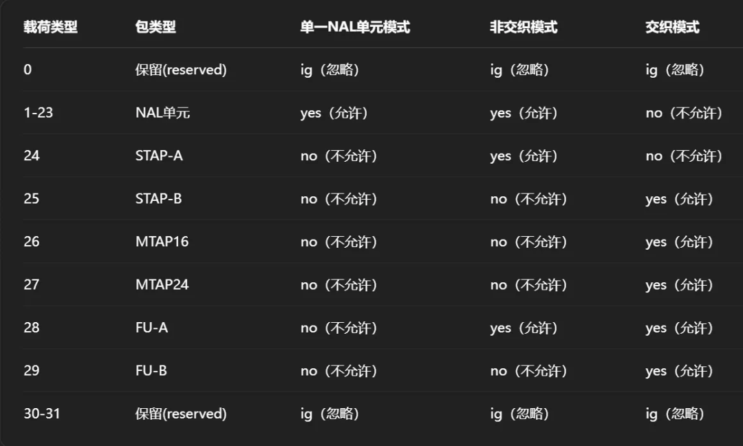 下表(表1)总结了 NAL 单元类型及其对应的 RTP 包类型(直接用作包载荷时):