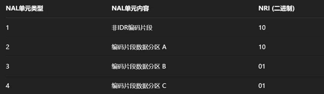 H.264 编码器在 NAL 单元类型(nal_unit_type)为 1 至 12 时,必须依据 H.264 标准(见7.4.1节)来设置 NRI 值。具体而言: