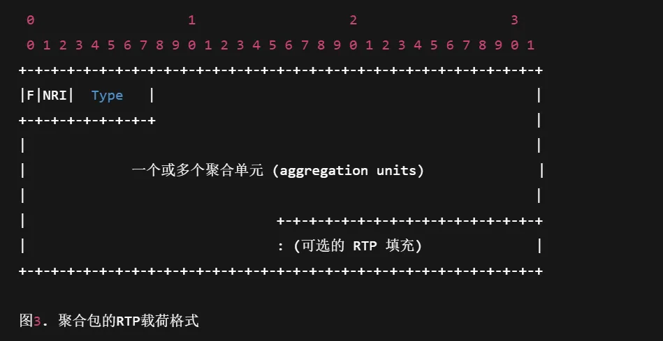 2、聚合包(Aggregation Packet):用于将多个 NAL 单元聚合到单个 RTP 载荷中。此类型包包含四个版本:
