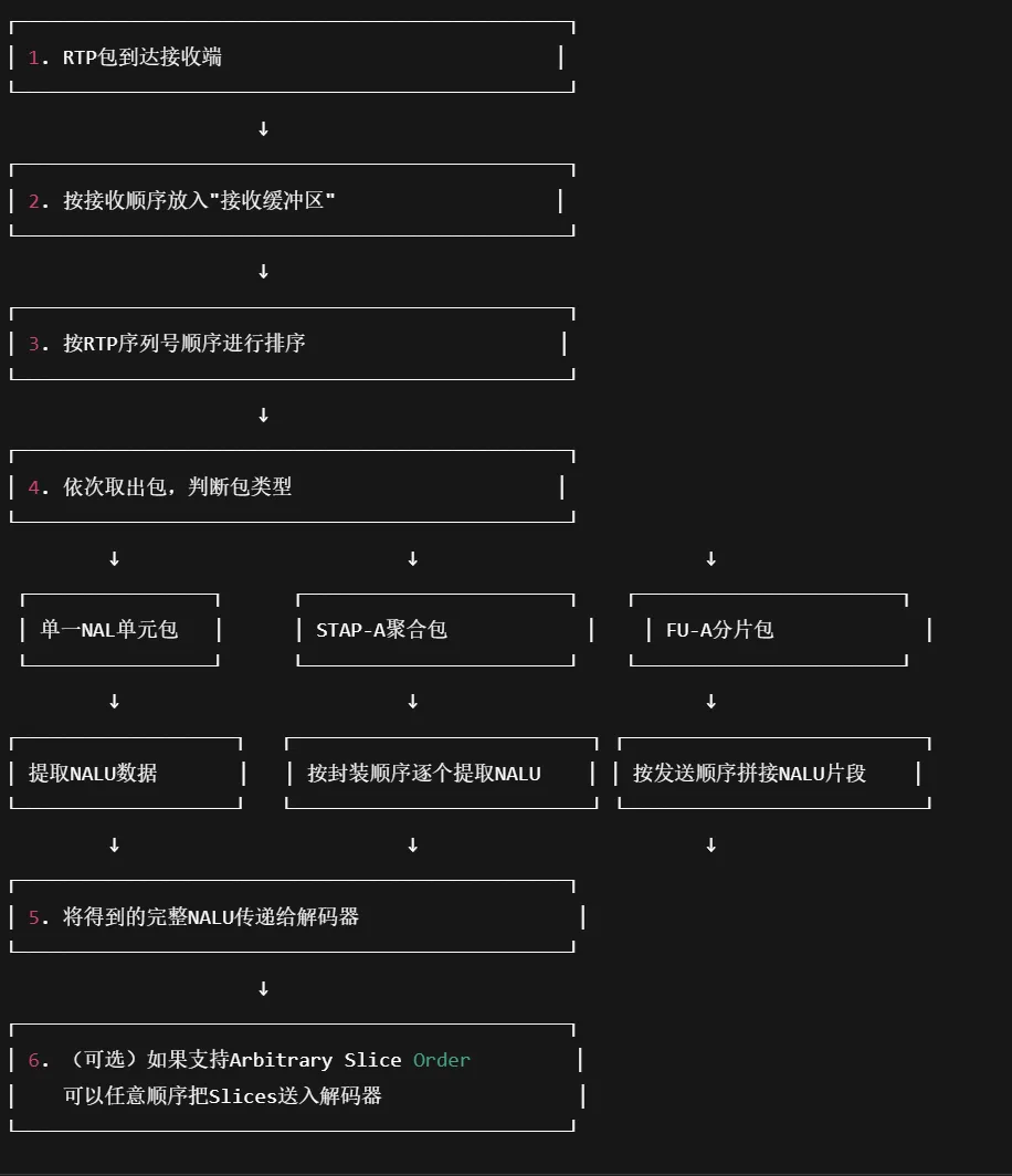 去封装(De-packetization)过程是依赖具体实现的。因此,下面的描述应被视为一种合适的实现示例。只要对于相同的输入,得到的输出与下述过程一致,其他的实现方式也可以使用。所谓“输出一致”,是指最终得到的 NAL 单元及其顺序完全相同。在此基础上,相比描述的算法,进行优化是可能的。 此外,所有正常的 RTP 机制(比如缓冲区管理)都适用。特别是,应移除重复的或过时的 RTP 包(可以通过 RTP 的序列号和时间戳来判断)。为了确定准确的解码时间,还必须考虑一些因素,比如为了实现正确的多流同步而引入的有意延迟等。