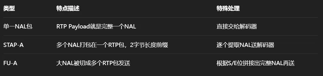 │ 单NALU包:直接读取NAL头 + Payload,送解码器 │