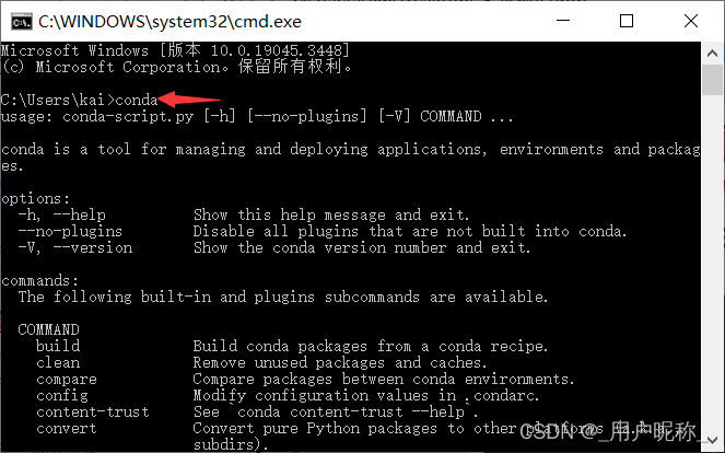 输入 cmd 打开 命令提示符,输入 conda,若出现下面图片的内容,即表示Anaconda的安装配置全部完成。