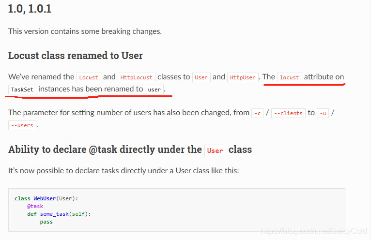 发现是自己忽略了1.0到1.0.1中“The locust attribute on TaskSet instances has been renamed to user.”TaskSet实例上的locust属性被重命名为user。