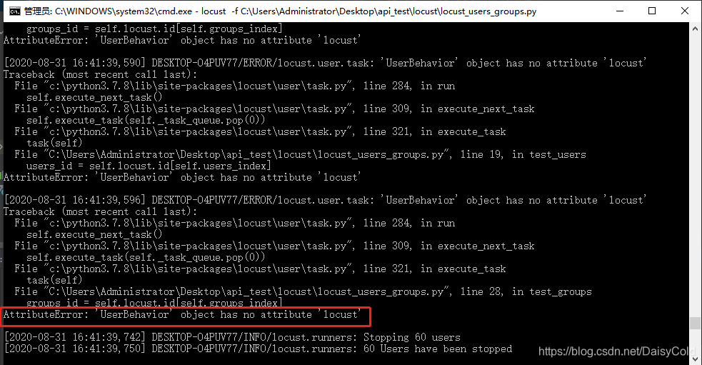 locust进行接口性能测试,使用之前的locust脚本模板报错:AttributeError: 'UserBehavior' object has no attribute 'locust'