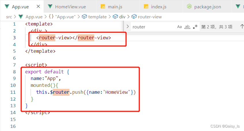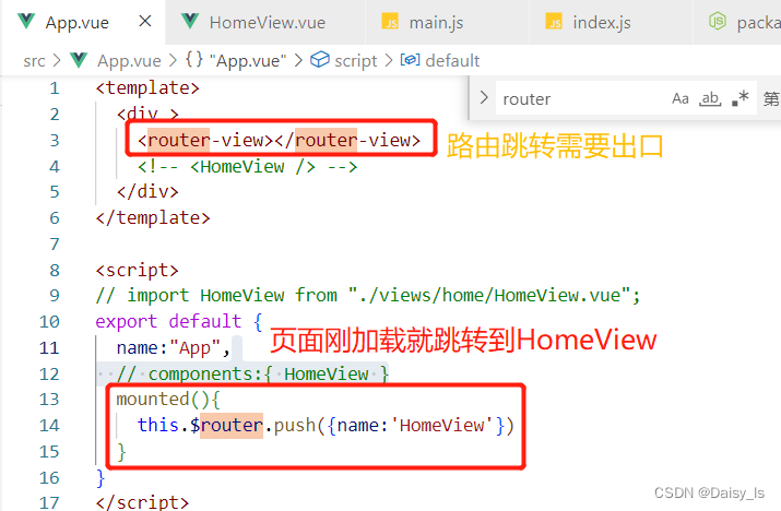 解决方案:添加路由出口(这个页面是tiao转到新页面,所以把 写在App里更适合,同时在App里写一个生命周期钩子,表示页面刚加载完就展示home页面,同时在点击时会跳转到这个出口页面,展示注册页面)