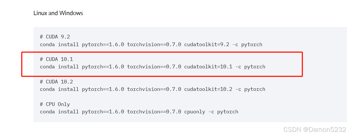 例如,我已经确认项目要求的是pytorch1.6的gpu版本,并且cuda是10.1,寻找对应的Windows指令(我使用的是Windows),那我的指令应当是: