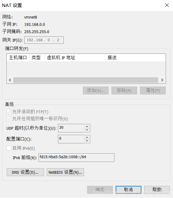 这里我将IP地址固定为 192.168.0.200,子掩网码和网关根据虚拟机的配置填写,具体见 Vmware 编辑 -> 虚拟网络编辑器 -> VMnet8 -> NAT 设置