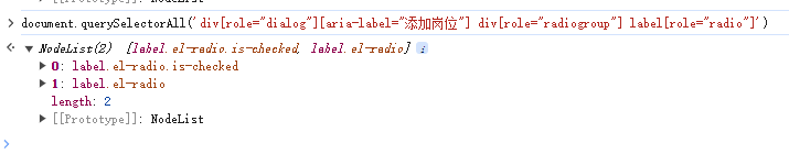 注意:div[role="dialog"][aria-label="添加岗位"]和div[role="radiogroup"]和label[role="radio"],之间,都有一个空格,表示一层一层向下查找。这样就找到了对应的2个label元素。