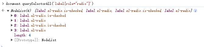 先按照label[role="radio"]这个selector去取值,通过在console框输入document.querySelectorAll('label[role="radio"]'),我们发现竟然有4个元素,与我们看到的2个元素不一样,说明还需要进一步的定位