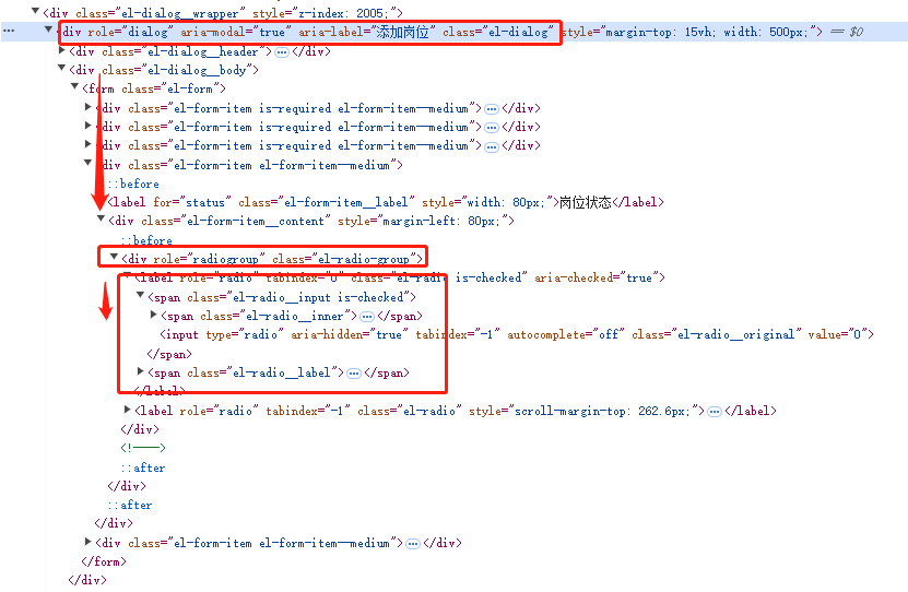 我们可以先找到role="dialog"并且aria-label="添加岗位"的div元素,再在里面查找role="radiogroup"的div,再继续查找role="radio"的label