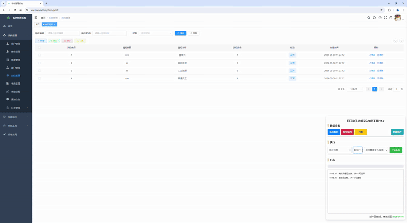 (1)还是以若依的演示平台为例,登录若依平台(https://vue.ruoyi.vip/index) 后,进入菜单【系统管理-岗位管理】。