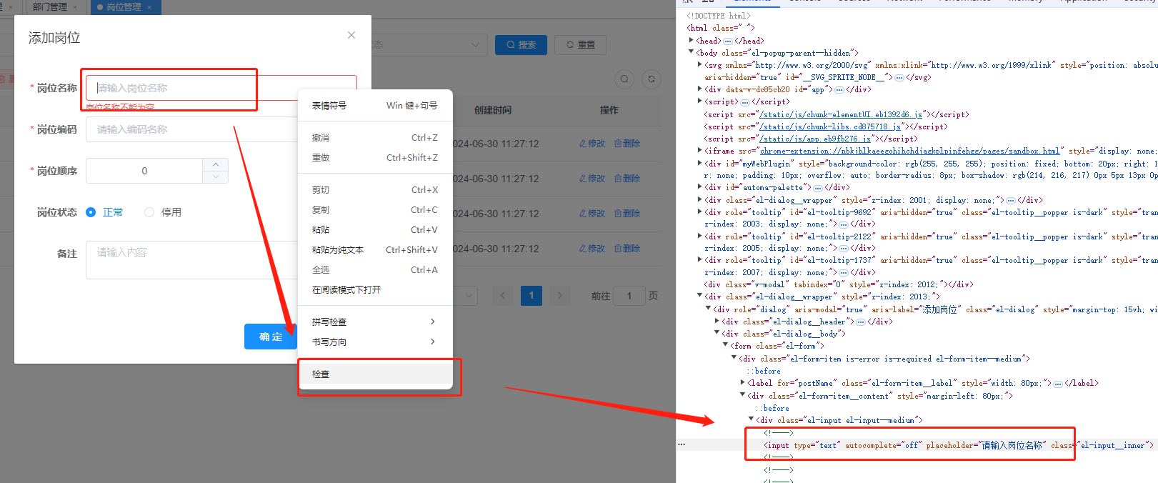 a.在“岗位名称”输入框上右键,选择“检查”,可以查询到元素的html结构