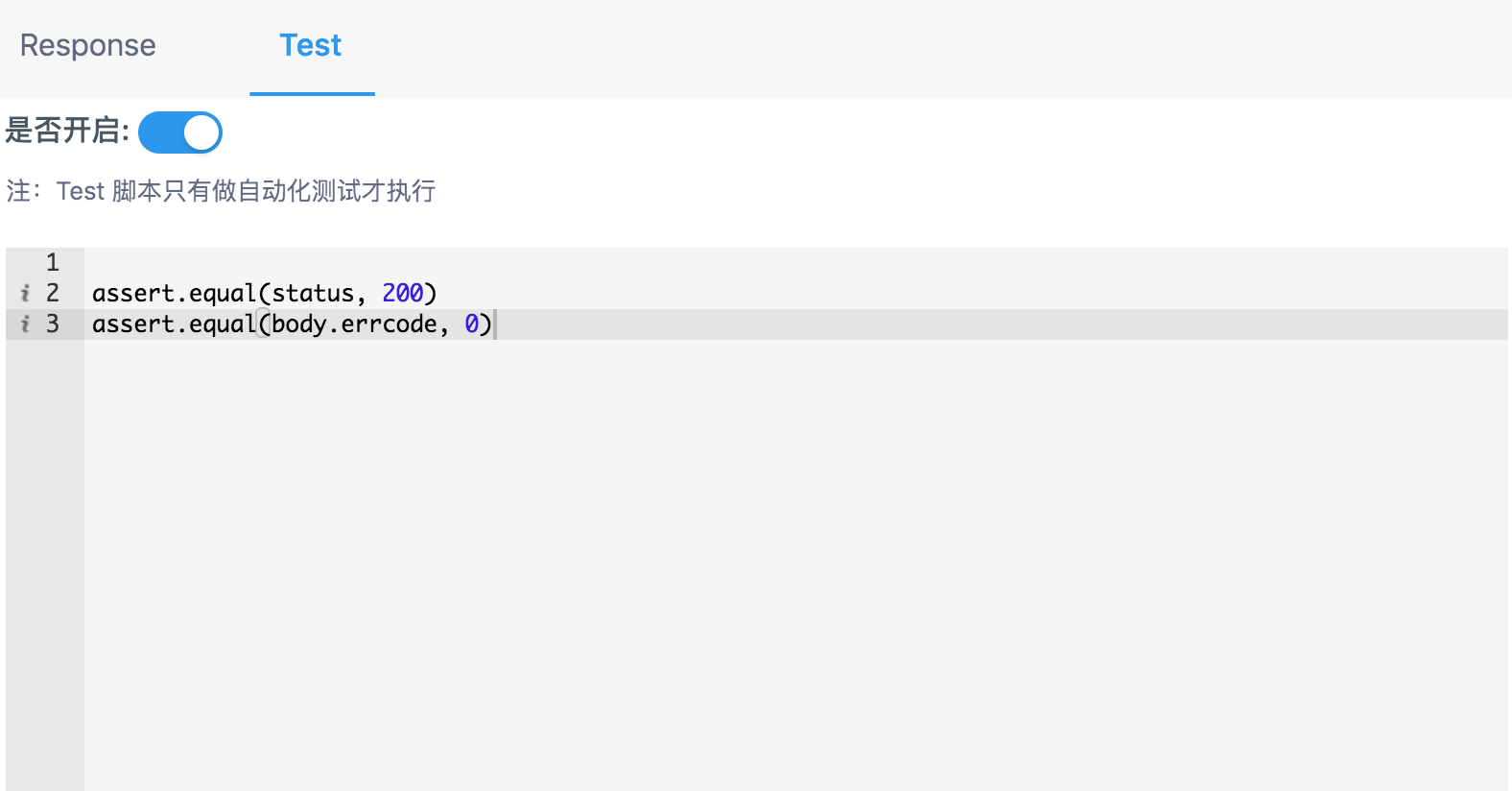 编写完请求参数,可通过 js 脚本写断言,实现精准测试,在接口用例页面点击 Test 编辑。