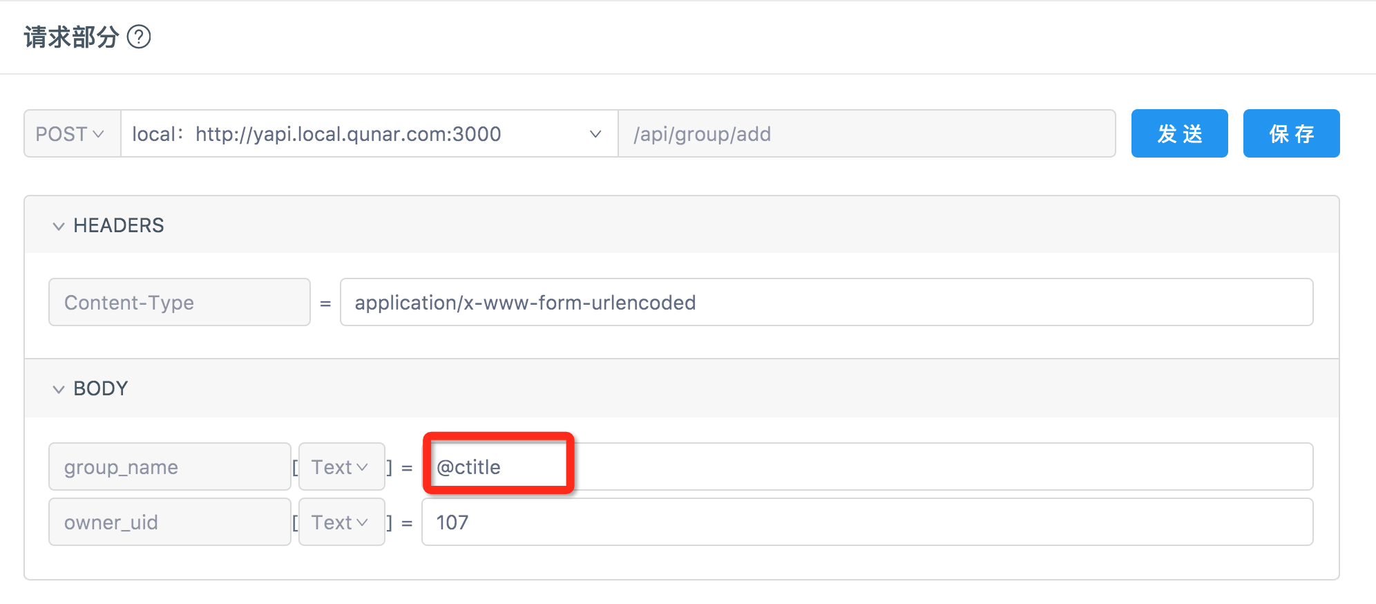 请求参数可以填写期望的字符串,YApi 还提供了 Mock 参数和 变量参数。Mock参数用来生成随机字符串,变量参数是为了解决请求参数依赖其他接口的返回数据或参数。