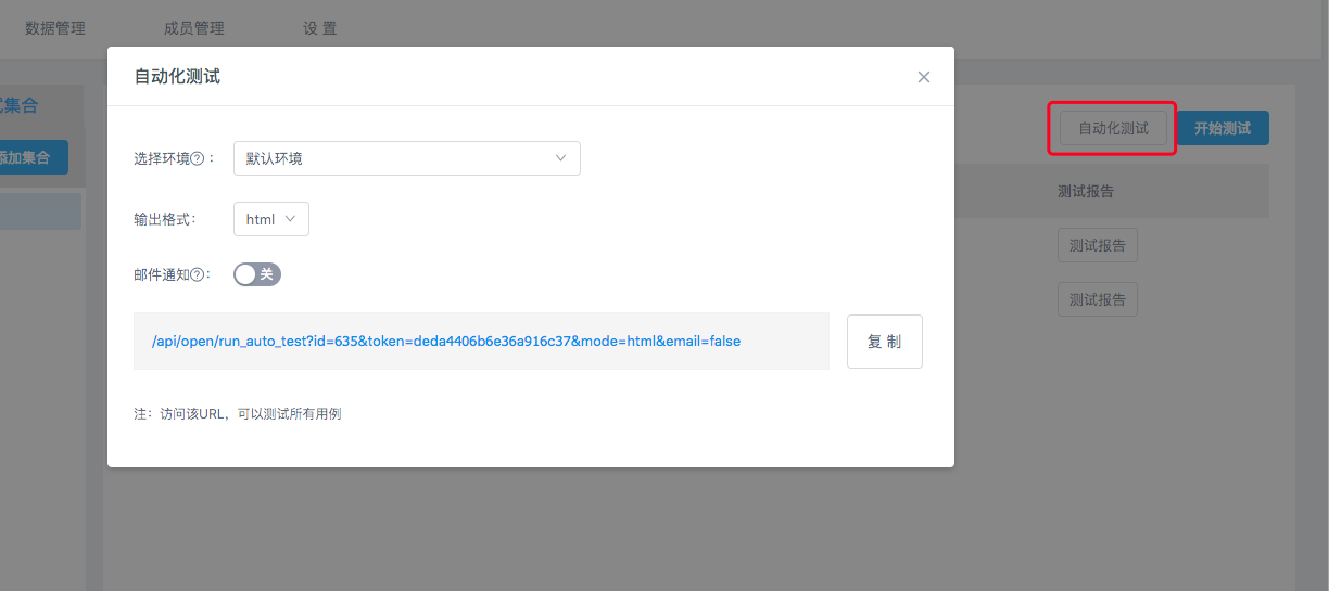 点击服务端测试,出现如下弹窗,用户访问该 url 就可以获取当前测试用例的所有测试结果。