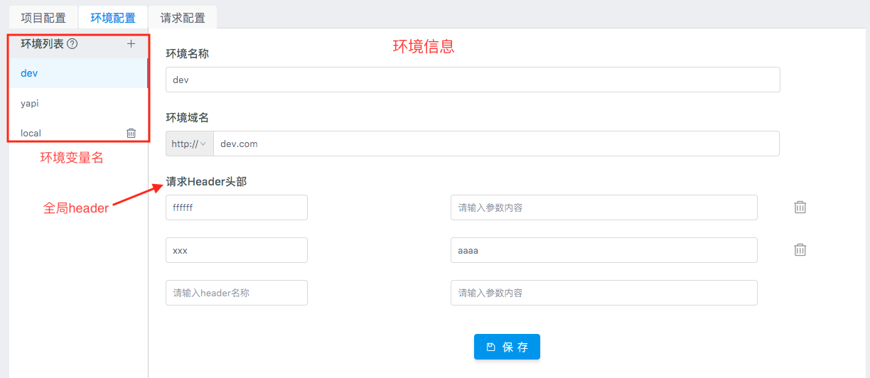 环境配置 一项可以添加该项目下接口的实际环境,供 接口测试 使用,这里增加了全局 header,可以在项目中设置全局 header 值。在接口运行页面的选择环境 select 中也增加环境配置弹层。