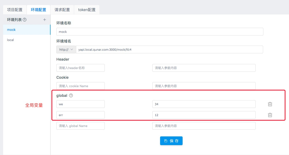 v1.3.21 新增全局变量,用户可以在环境列表中定义全局变量的名称和值, 接口运行或者测试集合里面可以通过 {{ global.err }} 来访问当前环境变量下定义的全局变量
