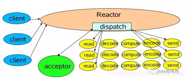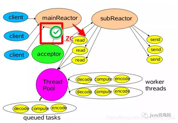 主从Reactor线程模型的特点是:服务端用于接收客户端连接的不再是个1个单独的NIO线程,而是一个独立的NIO线程池。Acceptor接收到客户端TCP连接请求处理完成后(可能包含接入认证等),将新创建的SocketChannel注册到IO线程池(subreactor线程池)的某个IO线程上,由它负责SocketChannel的读写和编解码工作。Acceptor线程池仅仅只用于客户端的登陆、握手和安全认证,一旦链路建立成功,就将链路注册到后端SubReactor线程池的IO线程上,由IO线程负责后续的IO操作。