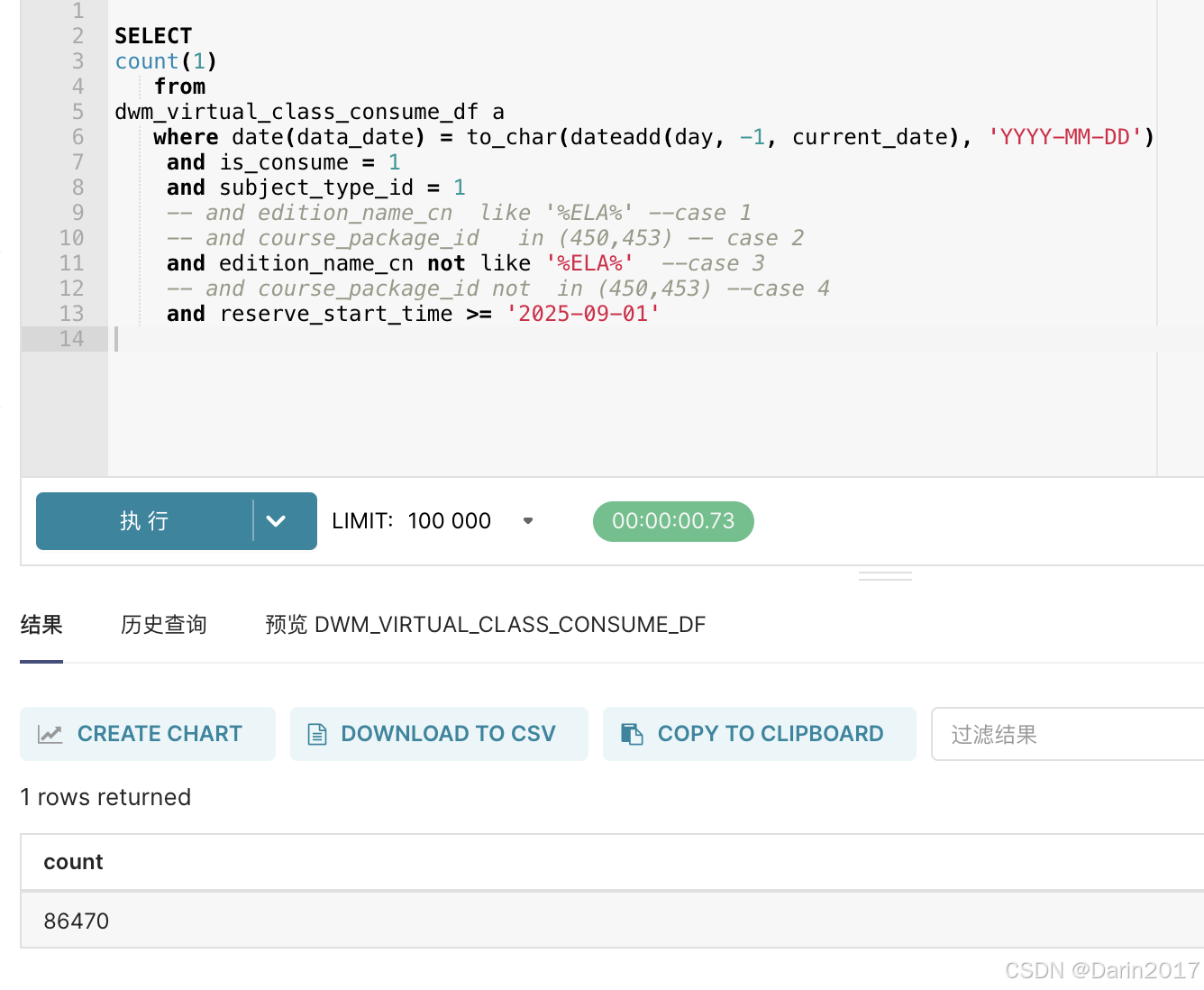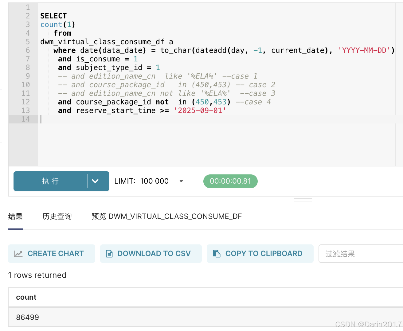 最终排查发现:由于not like的作用列有空数据,结果把空数据同样排除出去了,导致差异