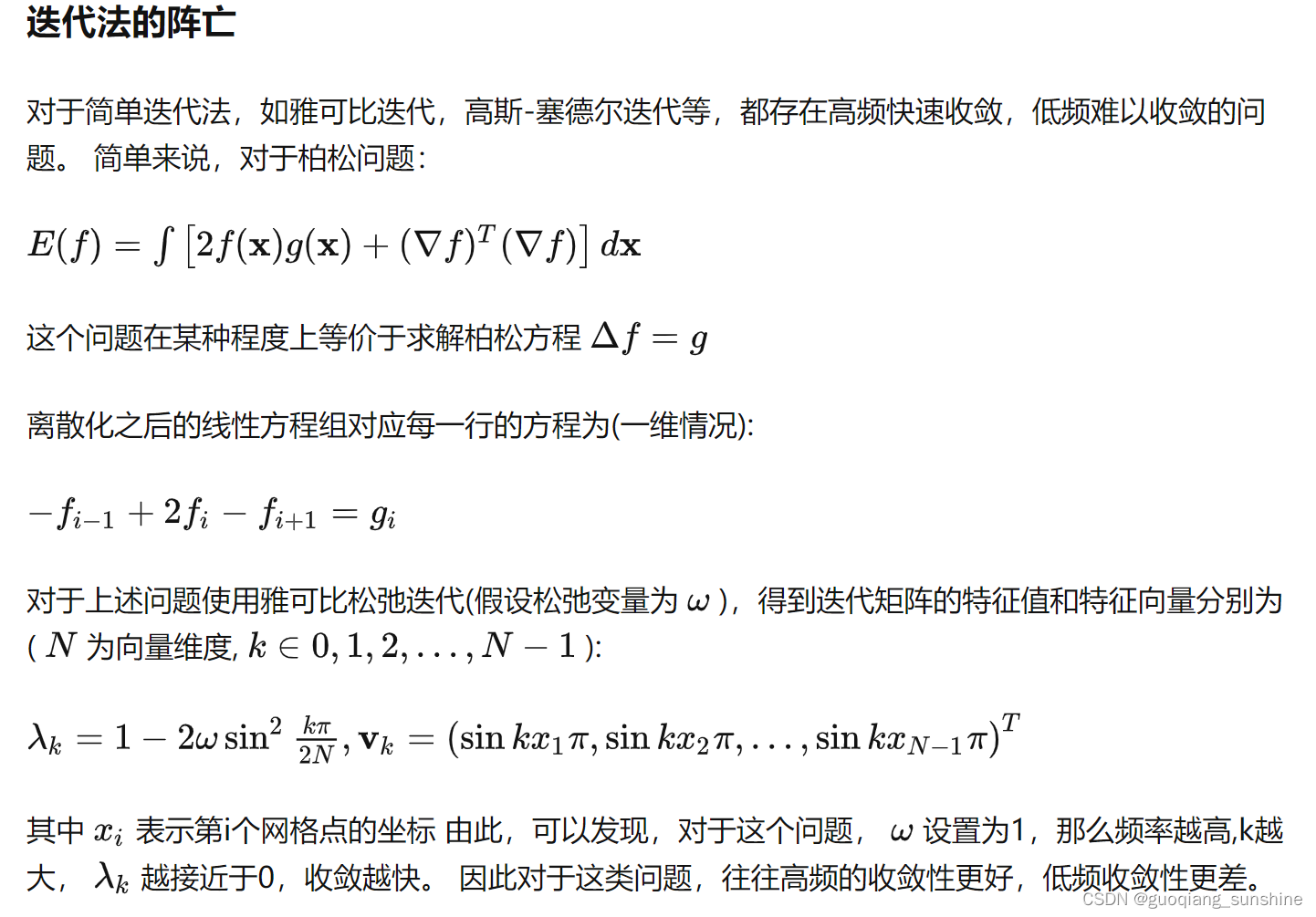 对于简单迭代法,如雅可比迭代,高斯-塞德尔迭代等,都存在高频快速收敛,低频难以收敛的问题。 简单来说,对于柏松问题: