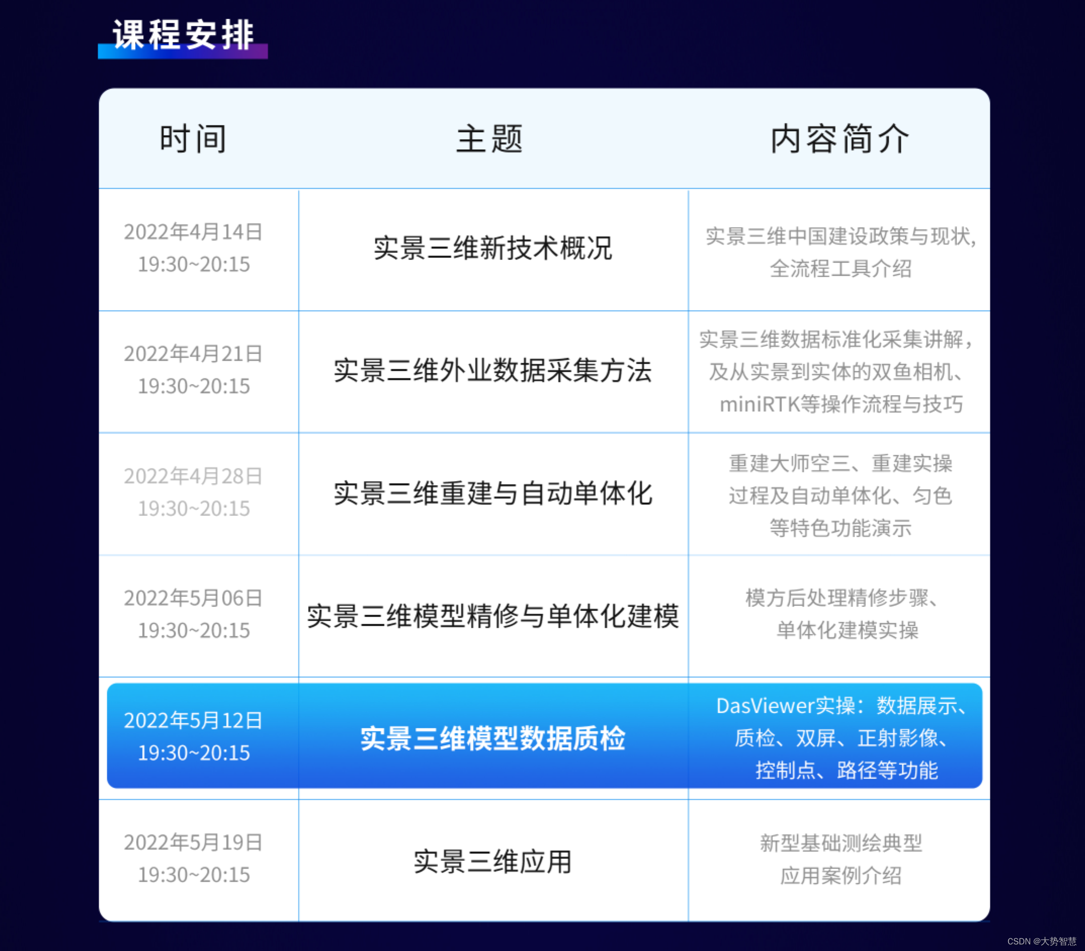 今晚(5.12)七点半,大势智慧视频号、B站直播间将为大家准时呈现“实景三维模型数据质检”的课程内容。
