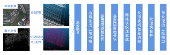 为解决这一难点,大势智慧提出“多源多角度数据融合建模”的解决路径,依据倾斜影像空三加密计算生成倾斜密集点云后与机载激光点云有效融合,构建TIN网,自动纹理映射等步骤,自动化实现了多源融合数据成果输出,提高模型精度。