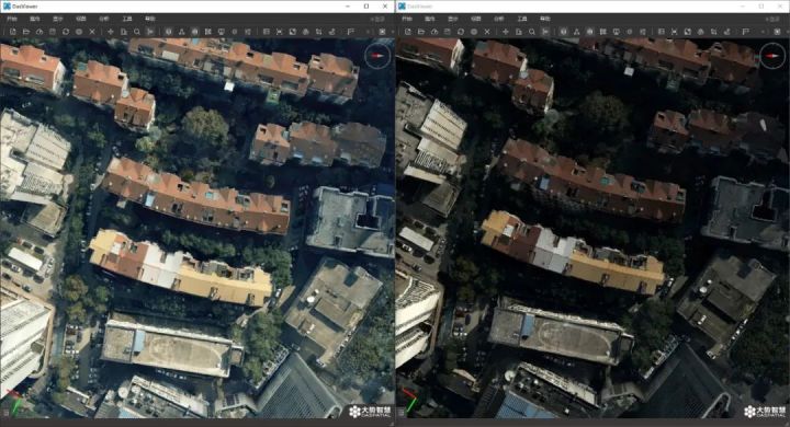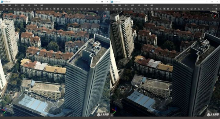 不同于无人机低空摄影,武汉试点部分区域采用大飞机进行高空采集,采集飞行空域与时间段受到严格要求,更要直面飞行高度、云层遮挡、光线不一、光照不均等方面的影响,导致数据原片整体偏暗且明暗不均,影响输出模型质量与效果。