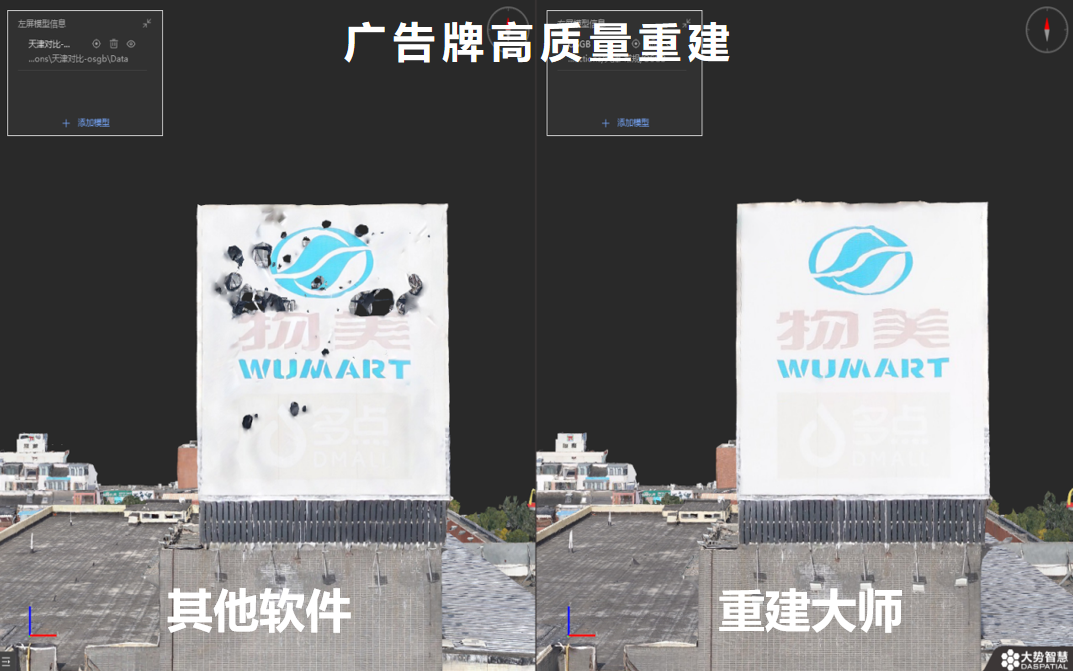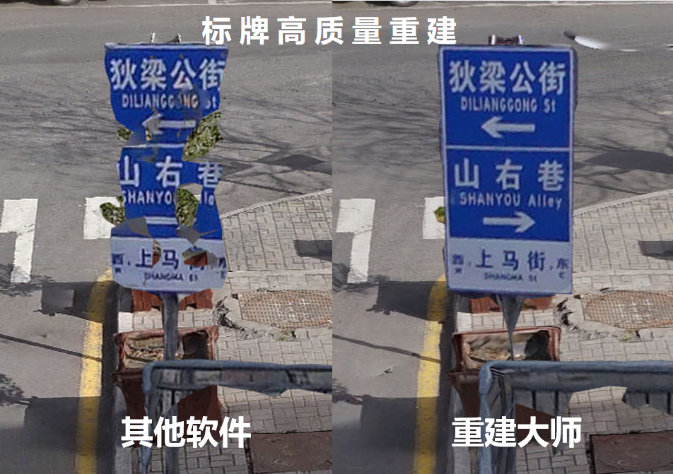对此,大势智慧将人工智能融入摄影测量与计算机视觉中,让重建大师在具备“大数据空三稳过”的前提优势下,运用“先识别再重建”的智能化三维重建技术,有效保证了建筑立面、水面、植被等弱纹理区域与道路标牌、广告牌、建筑围栏、化工圆筒、路灯等细薄区域的建模质量,大大提升了模型的整体效果。