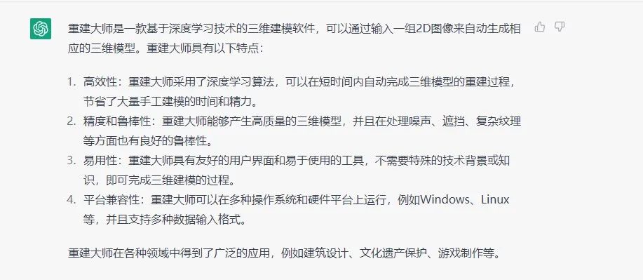 短短不到一分钟时间,ChatGPT已经概括出重建大师的基本特性与典型优势。当然,在各行各业高速发展的今天,人工智能早已不是新鲜之物。如何利用人工智能,辅助当前社会与生活的高质量建设已成为科技发展趋势,“人工智能+”的赛道早已“宾客满堂”。