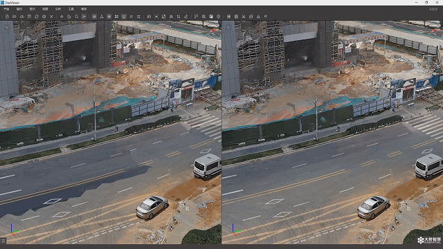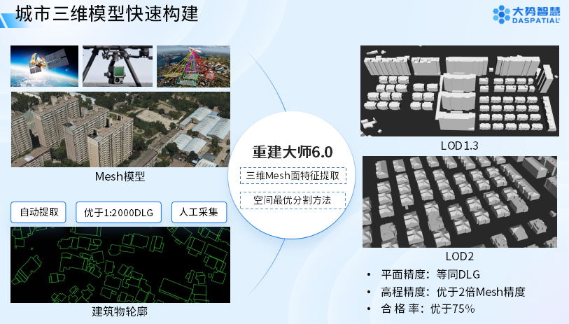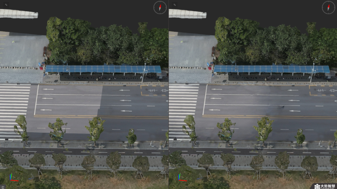 大势智慧所推出的超大规模实景三维集群建模软件——重建大师6.0,将人工智能融入到摄影测量和计算机视觉中,采用全息采集手段,对倾斜摄影、空中激光、车载激光、背包激光等多源数据进行全自动空三计算、密集点云生成、构建TIN网、自动纹理映射等步骤,实现全自动成果输出,提高模型精度,极大改善了近地面端和遮挡导致的模型缺失和扭曲。