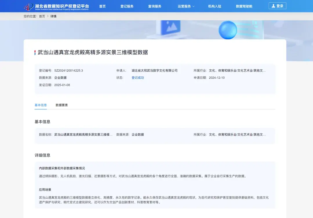 近日,由武当山文化旅游发展集团投资、武汉大势智慧科技有限公司参与实施的数字武当项目成功获得湖北省知识产权保护中心授予的《数据知识产权登记证书》。这是湖北省首张三维模型数据知识产权登记证书。