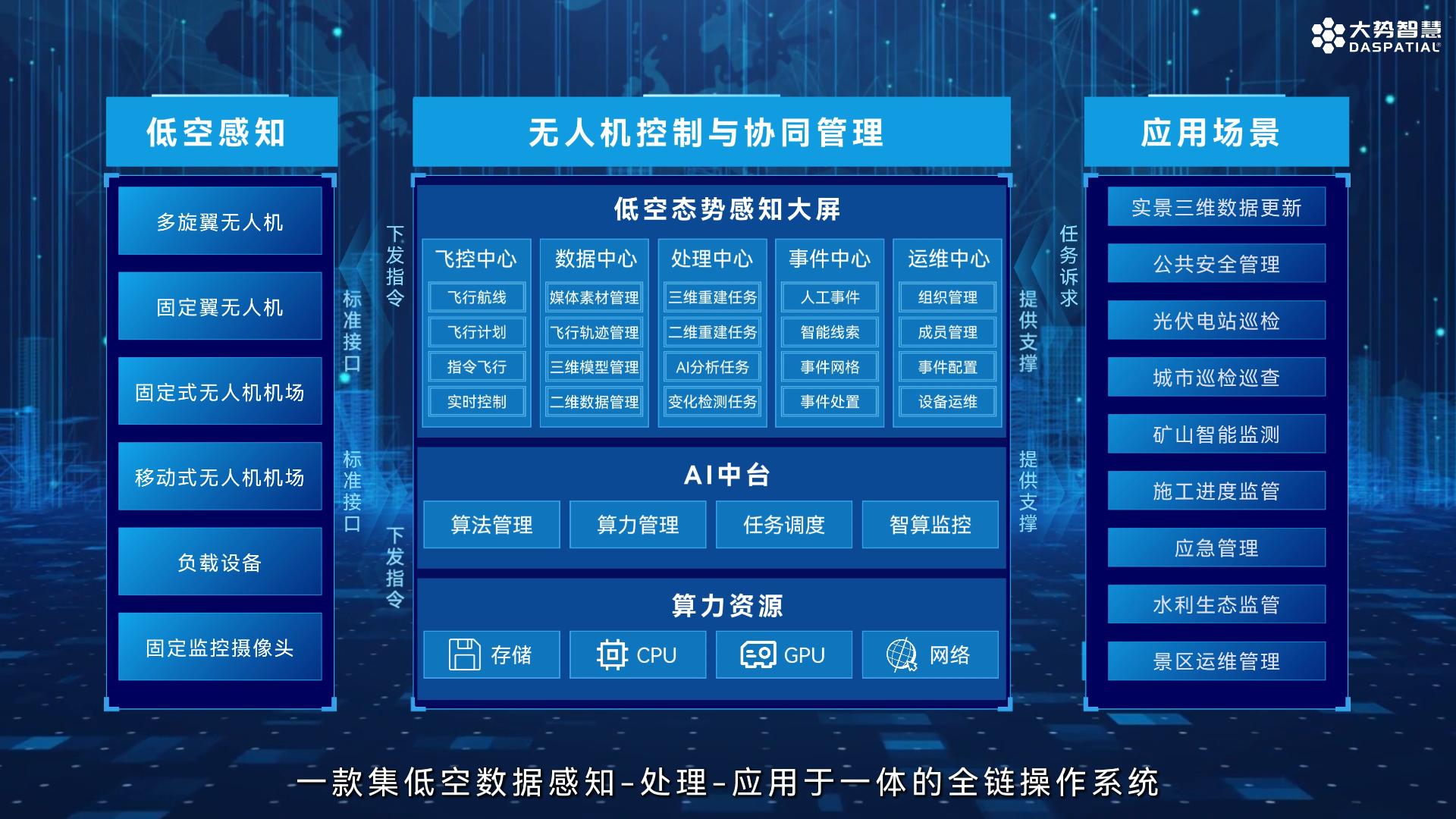 大势智慧作为人工智能与三维建模领域的领军企业,积极响应低空经济政策号召,探索三维建模、人工智能等技术在无人机飞行控制、作业分析等场景的创新应用。依托多年的技术积淀,自研低空三维AI智算系统“低空大师”,目前在城市管理、校园巡检、智能建造、交通巡检、光伏巡检等场景中落地了很多成熟应用,为这些领域的高效运营提供了有力支撑。