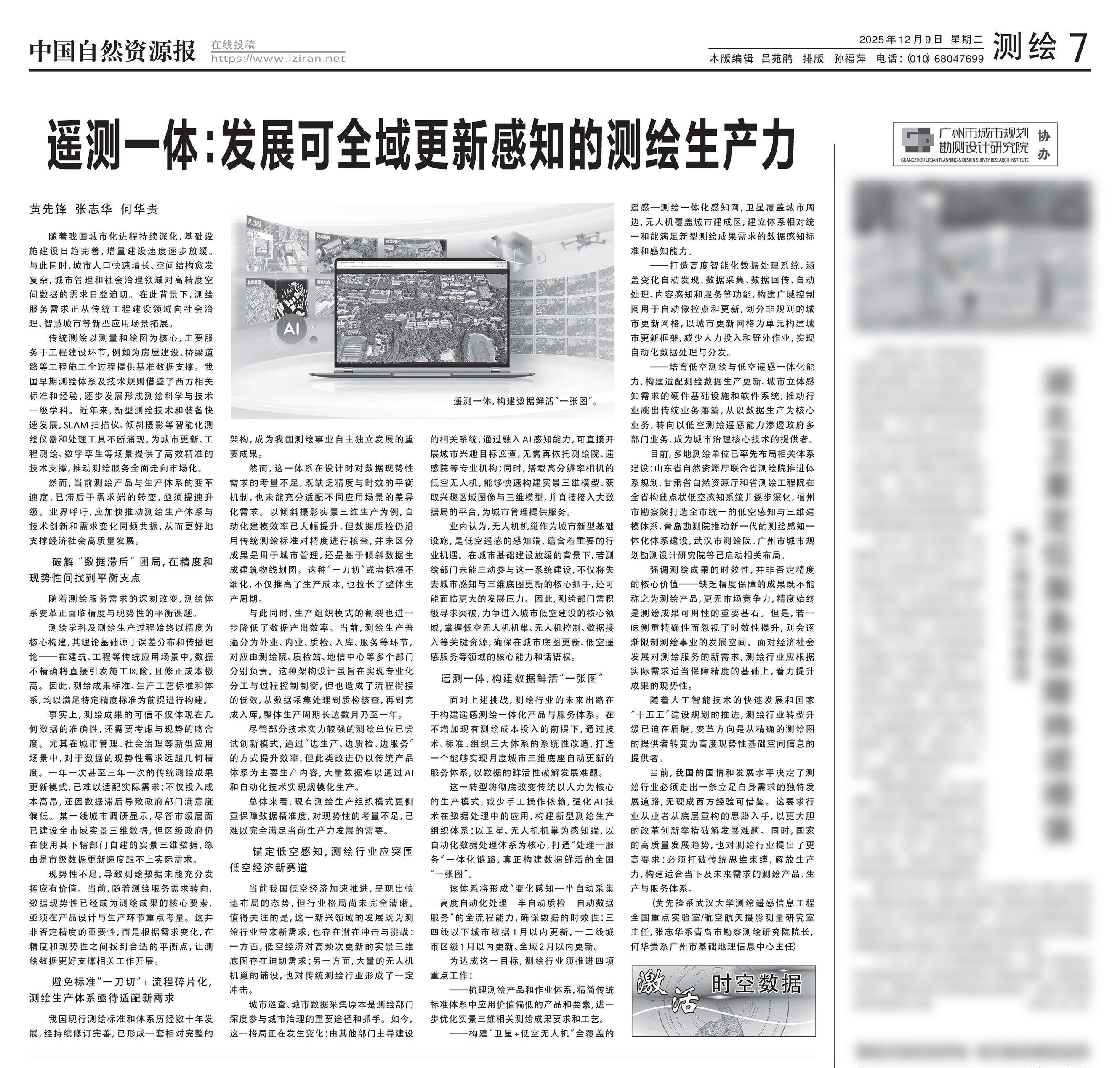 (黄先锋系武汉大学测绘遥感信息工程全国重点实验室教授/航空航天摄影测量研究室主任,张志华系青岛市勘察测绘研究院院长,何华贵系广州市基础地理信息中心主任)
