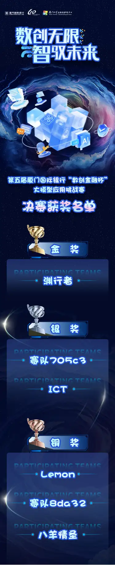 近日,第五届厦门国际银行“数创金融杯”大模型应用挑战赛圆满收官。本次大赛由厦门国际银行与厦门大学数据挖掘研究中心联合主办,“数创金融”联合创新实验室承办。赛事以“大模型在金融领域的应用”为主题,吸引了来自全国知名企业及国内外高校的上千名选手踊跃参与。