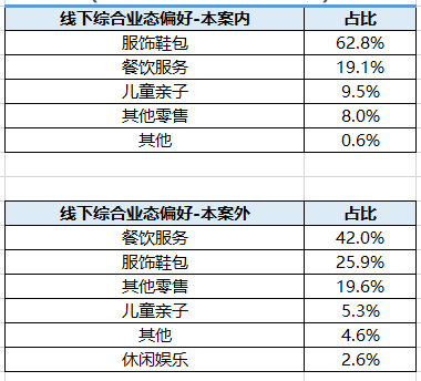 到访客群本商场内业态偏好第一名是服饰鞋包,排名第二的是餐饮服务,商场外客群偏好第一名是餐饮服务,第二名是服饰鞋包,客群业态偏好数据是非常重要的。