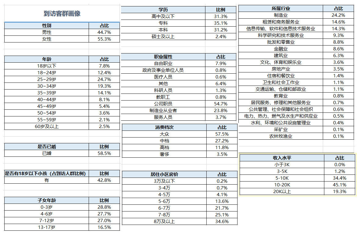 到场消费客群以女性居多,年龄集中在18到44岁之间,已婚占比是58.5%,相对于区域调研平均70%的占有率,这个数值不算很高,其中42.8%家庭有18岁以下小孩,其中12岁以下子女占绝大多数。本科以下学历占比较高,公司职员和制造业从业者占绝大多数,消费档次大众档次占比较大,所以商场选品应考虑这部分人群,以收入水平10k-20k的客群为主,5-10k的客群为辅。
