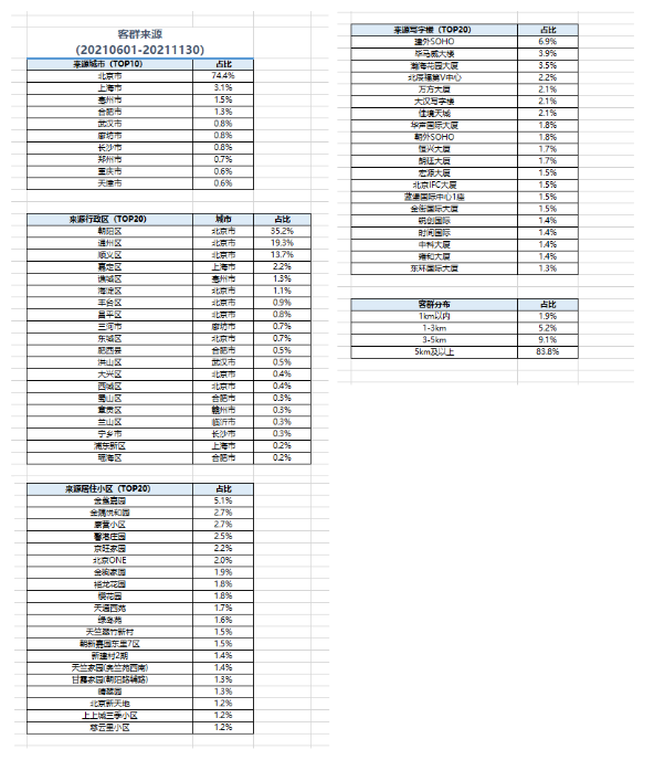 客流来源写字楼排名前三分别是建外SOHO、毕马威大楼和瀚海花园大厦,83.8%的客群都来自于商场5KM范围以外。