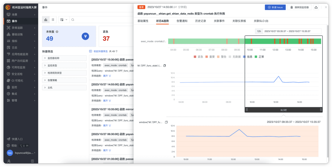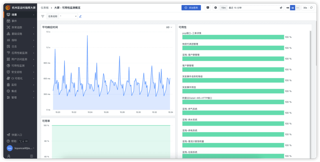 传统的业务观测不对设备软硬件、云服务器、数据接口、网络安全等做监控预警,但亚运作为重保项目,要求技术人员 7X24 小时保障“云上亚运村”的运行,对平台稳定性要求极高。所以快速掌握全链路上各项性能监控、快速识别风险、及时处置风险、定期回顾历史风险成了平台运行的重中之重。