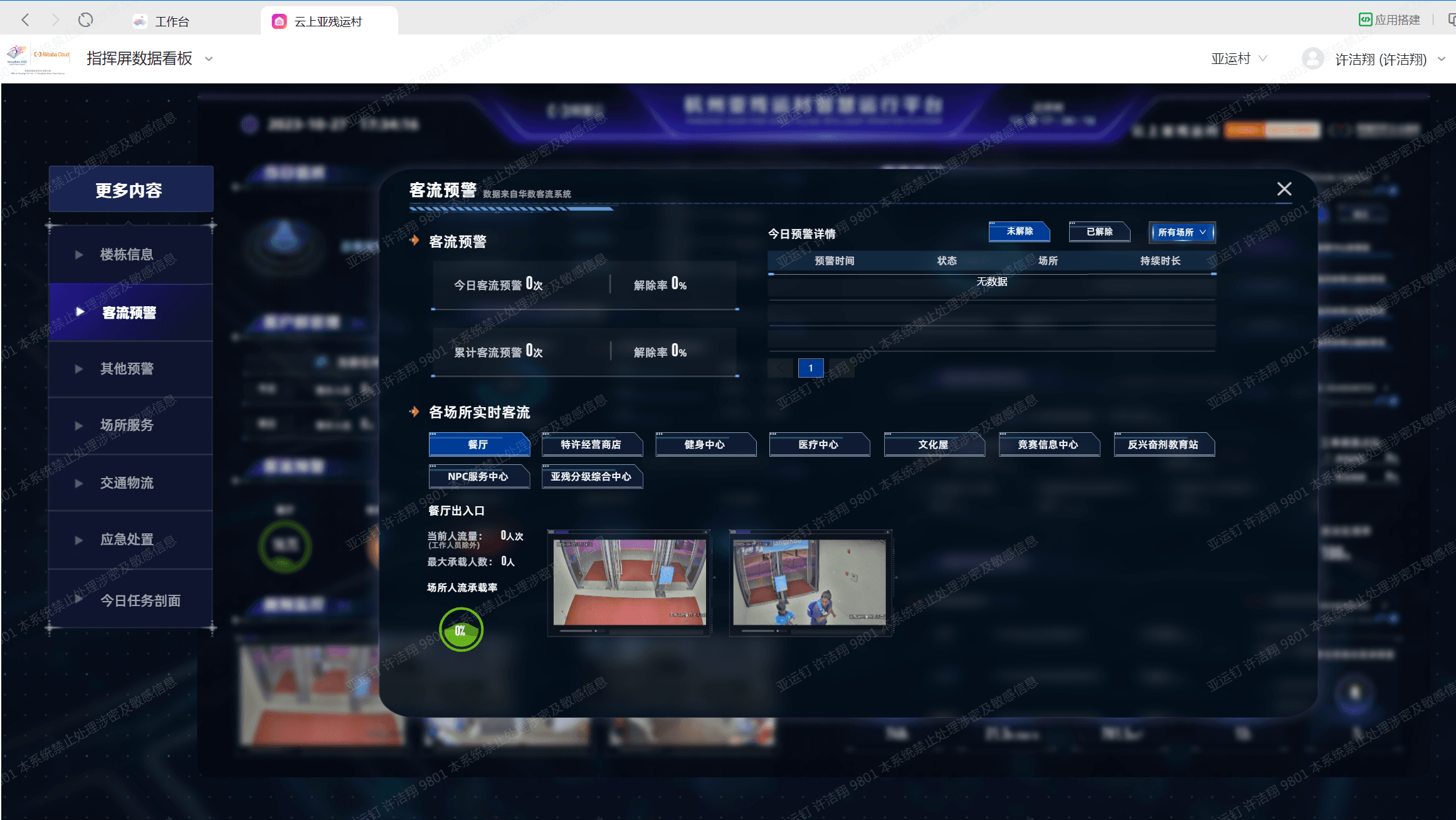 针对电力/客流过载/高影响气象/火警消控/电瓶车过温等场景进行监控预警。预警时自动触发消息提醒、弹出对应的应急预案,联动线下处置结果,做到事前预警、事中定位/处置/跟踪、事后复盘分析。