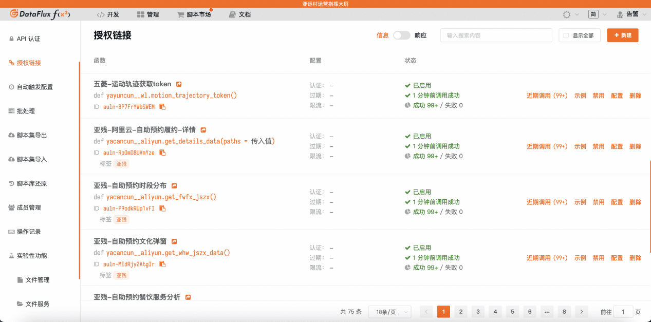 f(x) 平台共接入 3 种数据类型【文件导入、数据库链接和三方系统 API 】,共计 20 个系统,编写了 11 个代码模块包【包含 1 个内部编写的通用请求封装包,1 个 websocket 处理模块】,开放了 75 个授权链接,制作了 68 个自动触发任务【定时任务】,开放了 16 个文件服务,缓存了 1000+ 条数据。