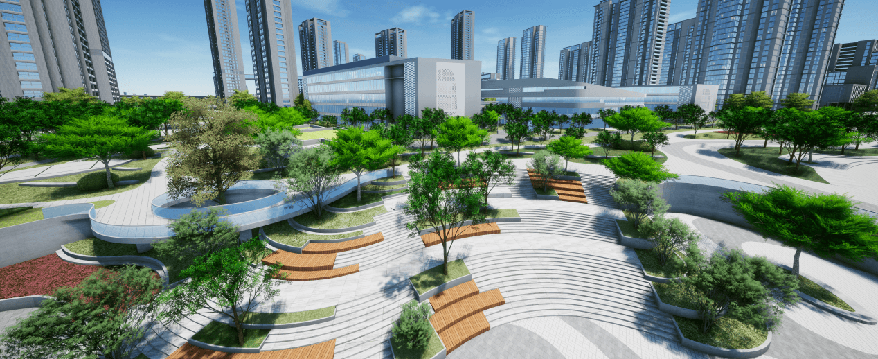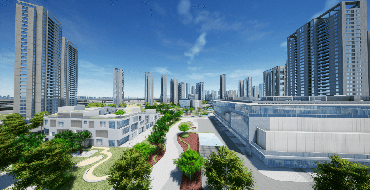 对亚运村范围(运动员村、媒体村、技术官员村)进行 L5 级精细化建模,对周边区域进行 L2 级简单建模。利用 Lumen 全局光照技、Nanite 虚拟几何体技术等建模与渲染方式,精细还原物理实体的纹理细节,实现照片级细节显示,与物理实体保持一致。