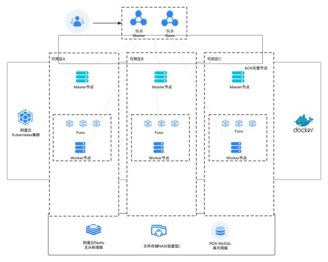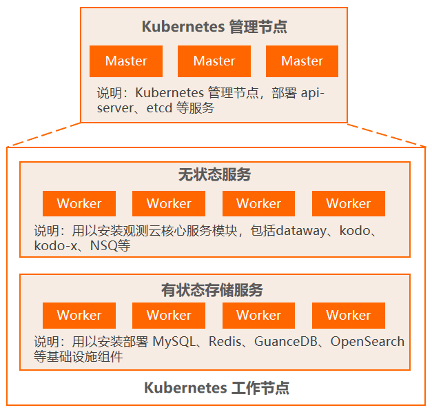 依托于阿里云的强大算力与调度能力,观测云建立并承载在阿里云之上。如下图架构图所示,此次我们在可用区选择上,使用同 region 的三个 AZ 部署,使得服务可用性达到 99.999999987%。使用阿里云 ACK 集群,work 节点配置部署观测云的核心服务模块,如 dataway、kodo 等,同时使用 RDS、NAS 等进行数据持久化存储。